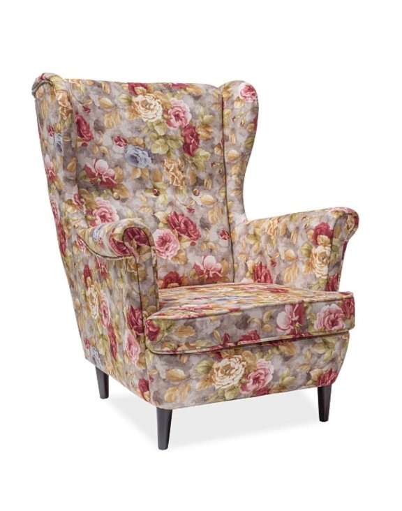 Vyniká klasickým dizajnom typu „ušák” s vysokým operadlom, širokými podrúčkami a pevnými drevenými nohami.