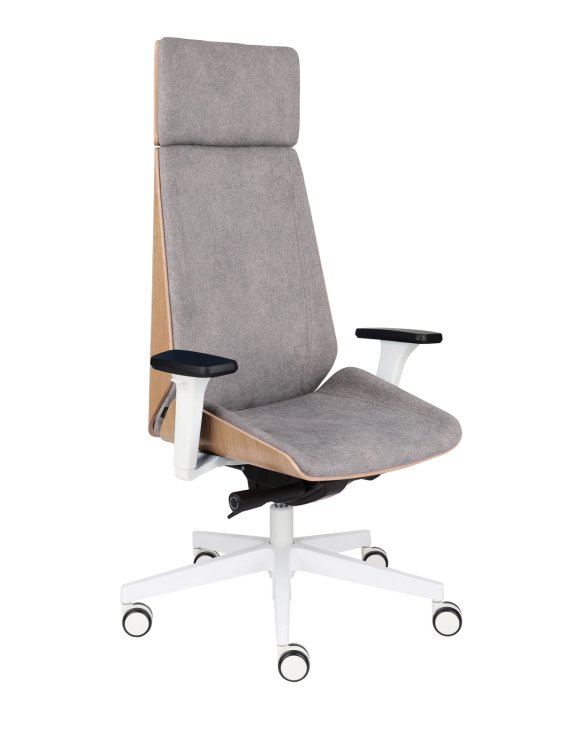 Nová verzia populárneho kresla Moon Wood – HD White, dubová dyha od značky Grospol s bielou konštrukciou a vybavená pohodlnou hlavovou opierkou.