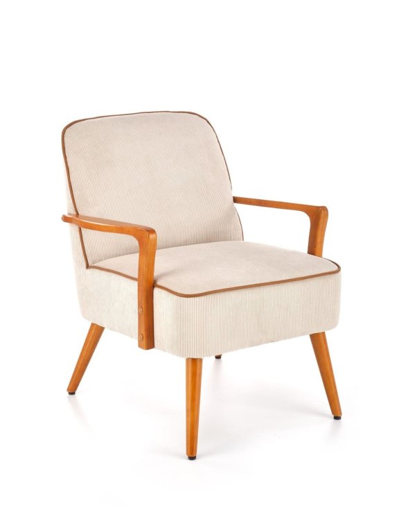Kreslo je čalúnené krásnou béžovou menčestrovou látkou a vďaka pridanému hnedému lemovaniu nábytok vyniká nad konkurenciou.