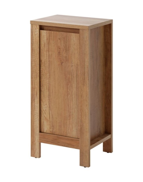 Skrinka je vyrobená z kvalitnej laminovanej dosky v dekore dub románsky a skvele ladí s bielou keramikou, betónom alebo čiernymi akcentmi.