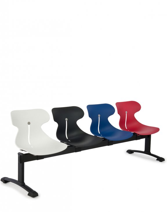 Štvormiestna lavica na čiernej oceľovej konštrukcii s jasne profilovanými sedadlami.