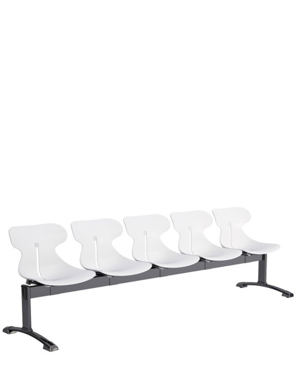 Päťmiestna lavica na čiernej oceľovej konštrukcii s jasne profilovanými sedadlami.