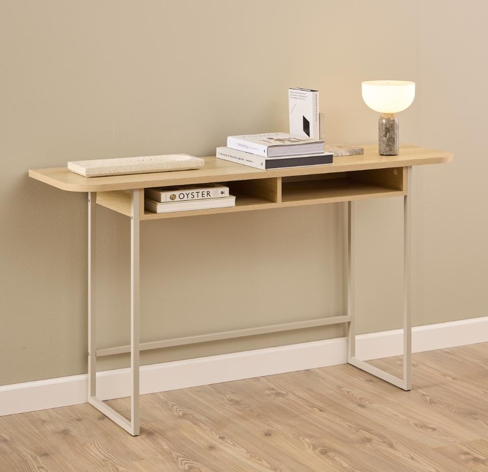 Jeho obdĺžnikový tvar a kombinácia dosky z laminovanej nábytkovej dosky v dekore duba s podnožou zo sivej ocele lakovanej práškovou farbou vytvárajú moderný, no zároveň útulný charakter.