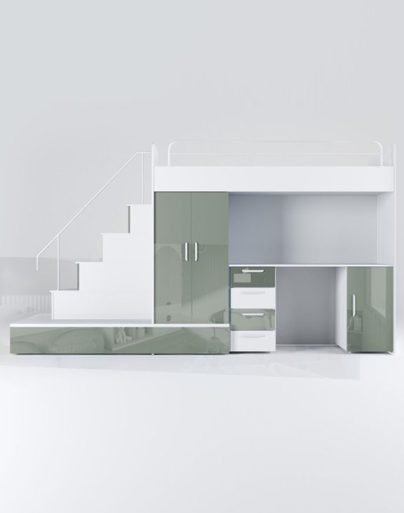 Kombinuje pohodlné miesto na spanie, praktický písací stôl, priestrannú šatníkovú skriňu a bezpečné schodíky s úložnou funkciou, navyše ponúka pohodlné sedenie a výsuvný matrac.