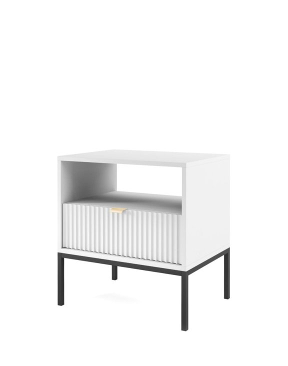 Nočný stolík Nova biely (S54) s čiernou konštrukciou značky Piaski je elegantný a funkčný kus nábytku, ktorý sa skvele hodí do spálne.