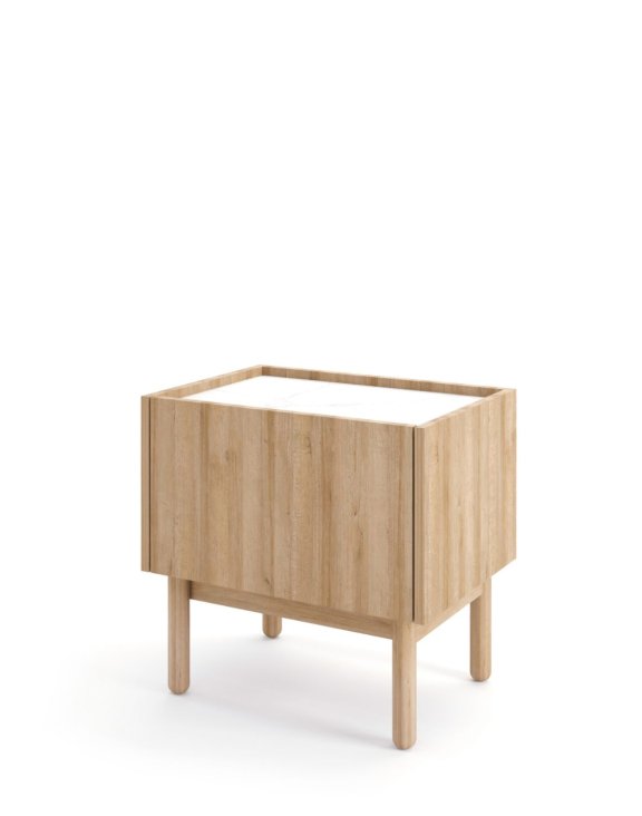 Jednoduchý, ale výrazný tvar je hlavnou prednosťou tohto nočného stolíka, najmä vďaka doske v dekore mramoru bianco.