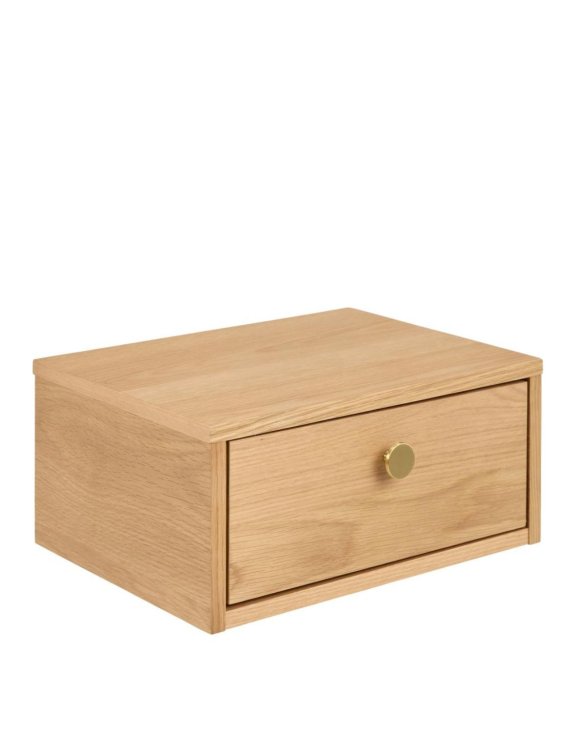 Skrinka má guľatú úchytku v zlatej farbe, ktorá jej dodáva eleganciu a jemne kontrastuje s prírodným odtieňom dreva.