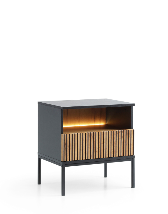 Nočný stolík Sento (S54) značky Piaski s LED osvetlením v odtieňoch čierna a dub wotan je elegantný a funkčný kus nábytku, ideálny pre spálňu inšpirovanú moderným štýlom.