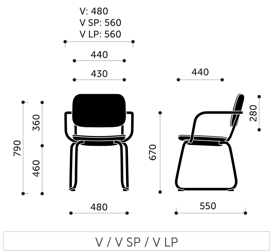Označenie V znamená stoličku na kovovej lyžinovej podnoži s priemerom 20 mm.