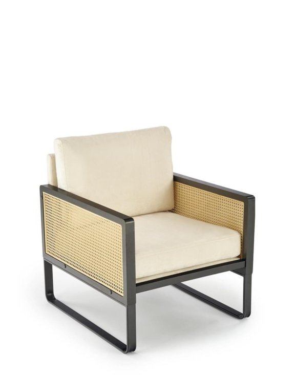 Podrúčky kresla sú vyrobené zo syntetického ratanu a masívneho dreva lakovaného na čierno, sedák a operadlo sú čalúnené svetlobéžovou zamatovou látkou.