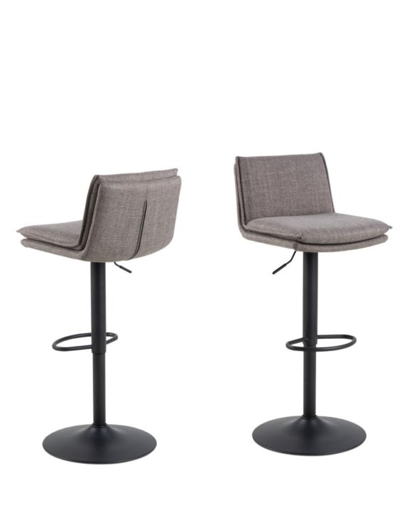 Barová stolička Flynn značky Actona, čalúnená látkou Basel vo svetlosivej farbe, má klasickú siluetu a je ideálna ako na rannú kávu, tak aj na večerné drinky.