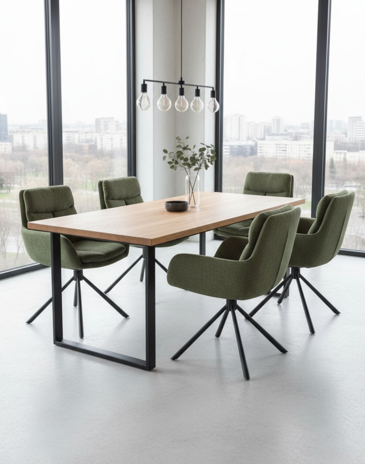 Stolička je čalúnená látkou so zaujímavou štruktúrou v olivovo zelenej farbe, ktorá dodáva interiéru prírodný nádych a jedinečný charakter.