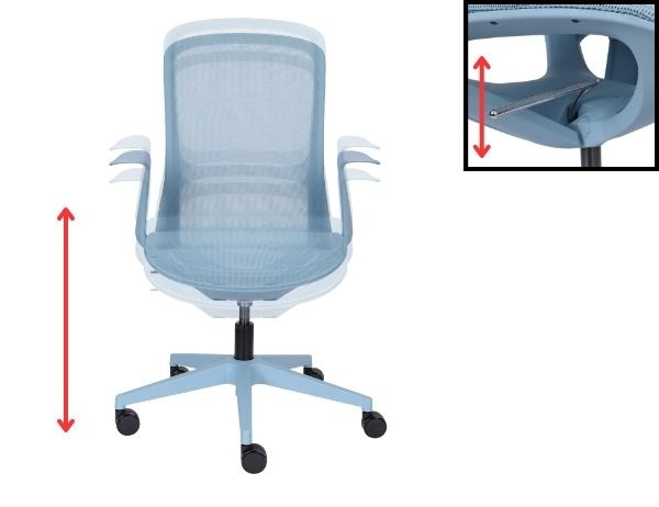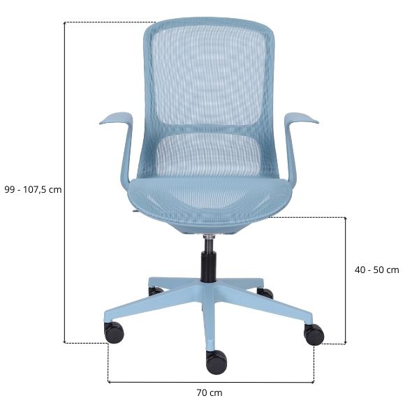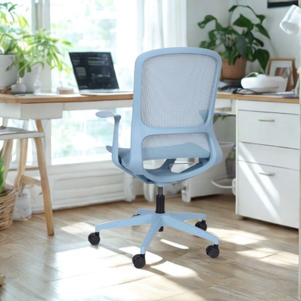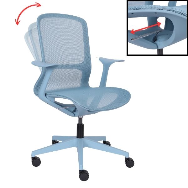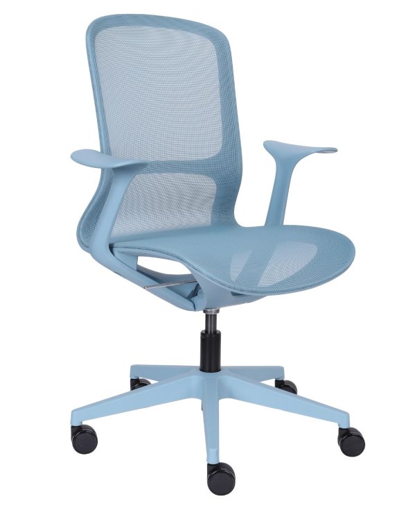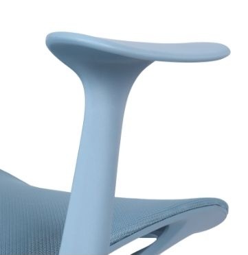 Sedadlo a vysoké operadlo sú vyrobené z odolnej a pružnej sieťoviny v pastelovo modrej farbe.