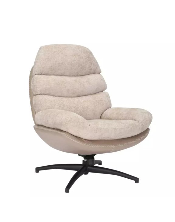Vďaka čalúneniu z mäkkej tkaniny v béžovej farbe a elegantnej zadnej časti zo syntetickej kože pôsobí kreslo moderne a zároveň útulne.