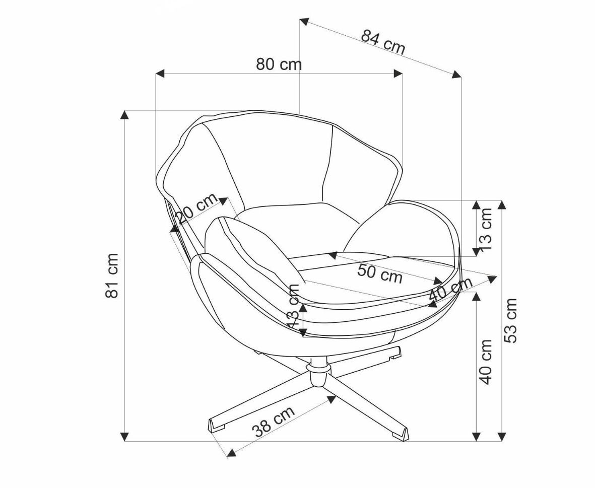 Rozmery: šírka 80 cm, hĺbka 84 cm, výška 81 cm, výška sedu 40 cm.