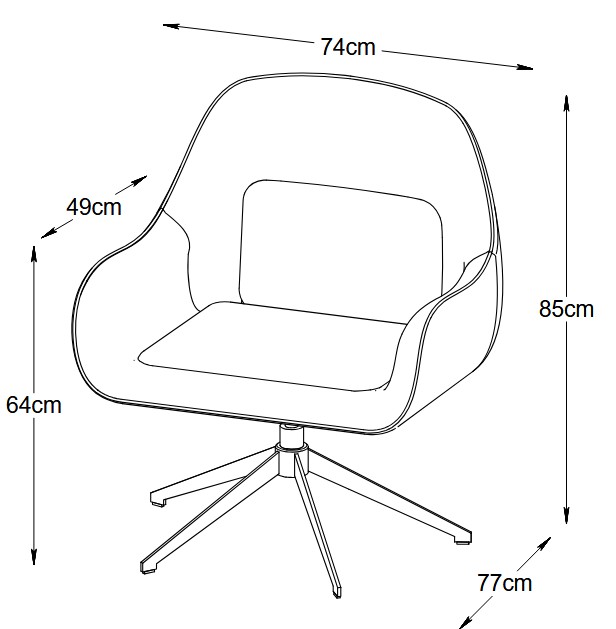 Rozmery: šírka 74 cm, hĺbka 77 cm, výška 85 cm. Rozmery sedadla: hĺbka 49 cm, šírka 50 cm, výška 45 cm. Výška podrúčok (od sedadla): 19 cm.