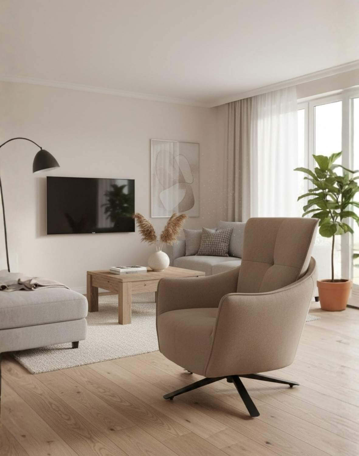 Kreslo Scampi v odtieni cappuccino je moderné relaxačné kreslo s otočnou funkciou 360°, navrhnuté s dôrazom na každodenné pohodlie a vizuálnu harmóniu v moderných interiéroch.
