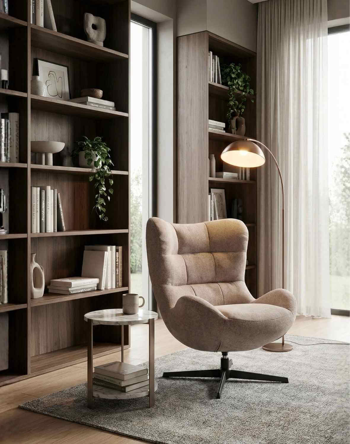 Moderná forma jemne odkazuje na kreslá typu „ušák“, čo celku dodáva osobitosť a eleganciu.