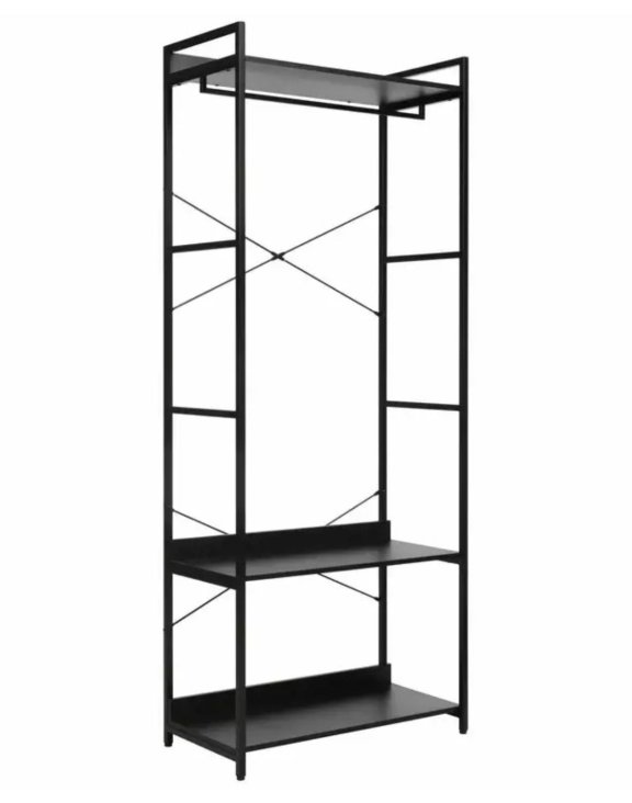 Jej konštrukcia je postavená na pevnom čiernom kovovom ráme a policiach v rovnakej farbe, čo vytvára elegantný kontrast a nadčasový vzhľad.
