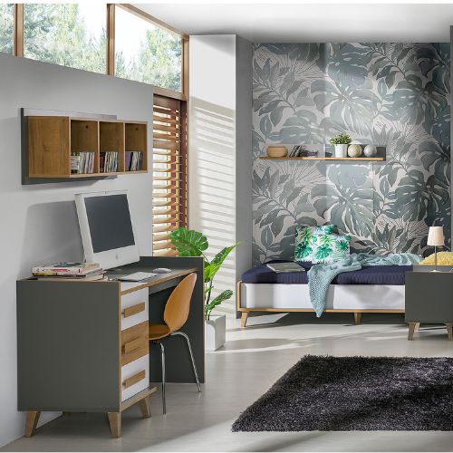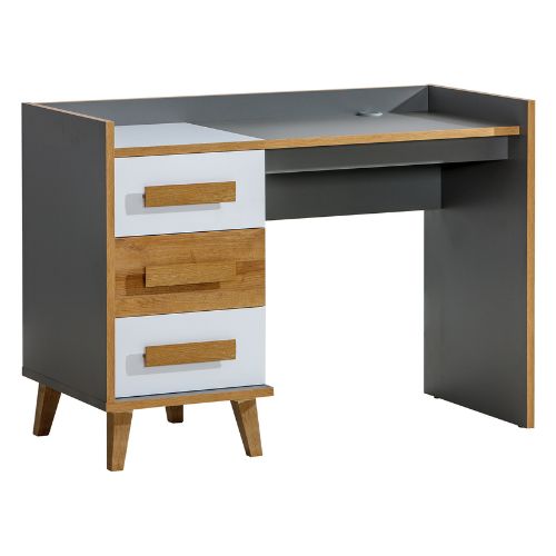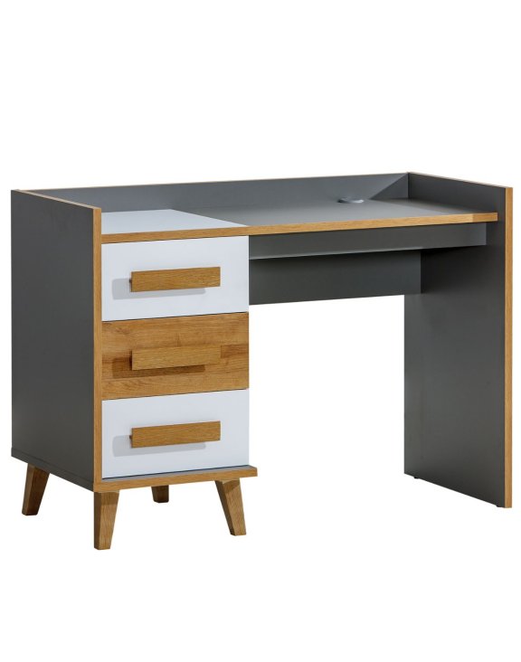 Stôl zaujme jedinečnou kombináciou farieb – matnej sivej, bielej a prírodného odtieňa dreva. Táto kombinácia z neho robí ideálnu voľbu ako do modernej kancelárie, tak do útulnej domácej pracovne, študentskej izby alebo kútika na učenie.