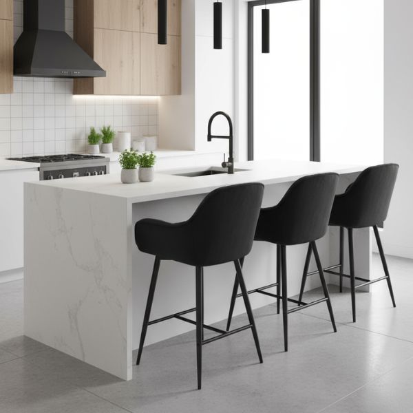 Mäkké zamatové čalúnenie Bluvel v čiernej farbe a pevná kovová konštrukcia v čiernom matnom prevedení vytvárajú štýlový a odolný kus nábytku vhodný do kuchyne, jedálne alebo baru.