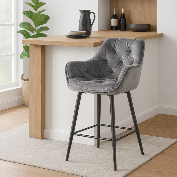Mäkké zamatové čalúnenie Bluvel v sivej farbe a pevná kovová konštrukcia v čiernom matnom prevedení vytvárajú štýlový a odolný kus nábytku vhodný do kuchyne, jedálne alebo baru.