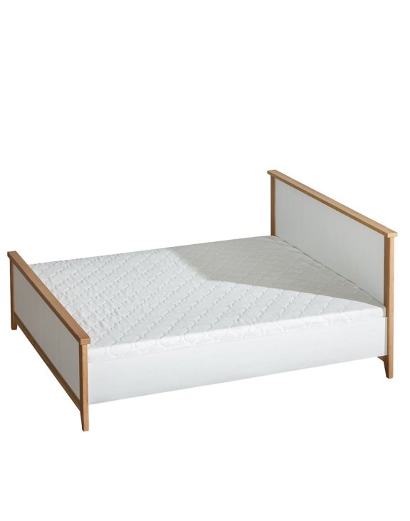 Konštrukcia postele je založená na pevnom korpuse v bielom drevenom dekore, ktorý jej dodáva ľahkosť a sviežosť. Rám a hrany sú doplnené o prvky v teplom odtieni duba, čo nábytku dodáva útulnosť a eleganciu. Vďaka tomu sa posteľ skvele hodí ako do svetlých, moderných spální, tak aj do klasických interiérov.