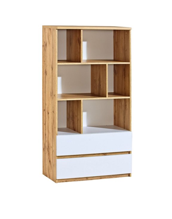 Regál vo farebnej kombinácii dub wotan a arktická biela vytvára zaujímavý efekt, ktorý interiér rozjasňuje a zútulňuje.