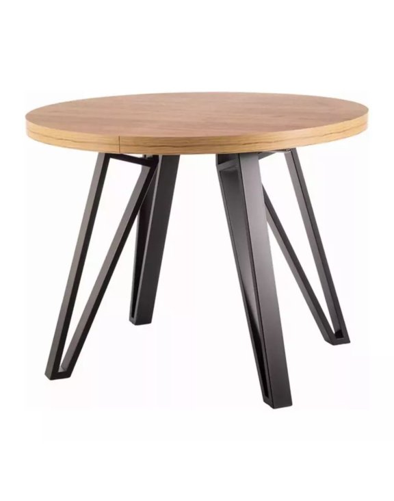 - Okrúhla doska v teplom, prírodnom odtieni dreva v kombinácii s geometrickými kovovými nohami vytvára výrazný vizuálny efekt.