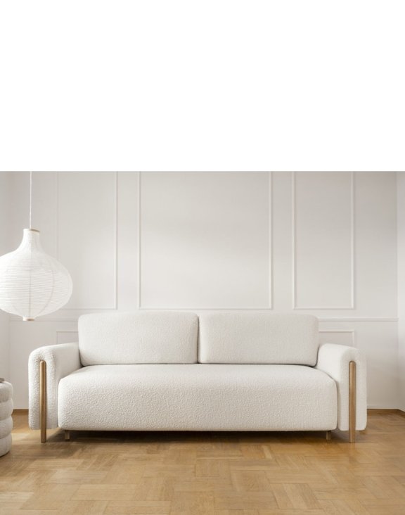 Vysoké drevené nohy v dubovom odtieni dodávajú pohovke ľahkosť a umožňujú jej jednoduché zapadnutie do rôznych štýlov interiéru. Charakteristické boky, krásne zdobené a funkčné, sú výnimočným prvkom, ktorý priťahuje pozornosť a dodáva miestnosti jedinečný charakter.
