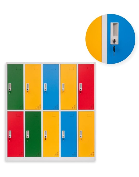 Každá priehradka je vybavená vačkovým zámkom na kľúč, ktorý zaisťuje bezpečnosť uložených vecí, a decentné perforácie v rohoch dvierok umožňujú ventiláciu vnútorného priestoru.