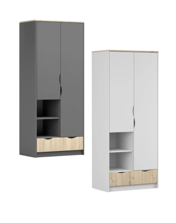 Šatníková skriňa JOY 2D je moderný kus nábytku, ktorý spája funkčnosť s elegantným štýlom – ideálna voľba do študentskej izby, izby pre teenagerov alebo kompaktnej spálne.