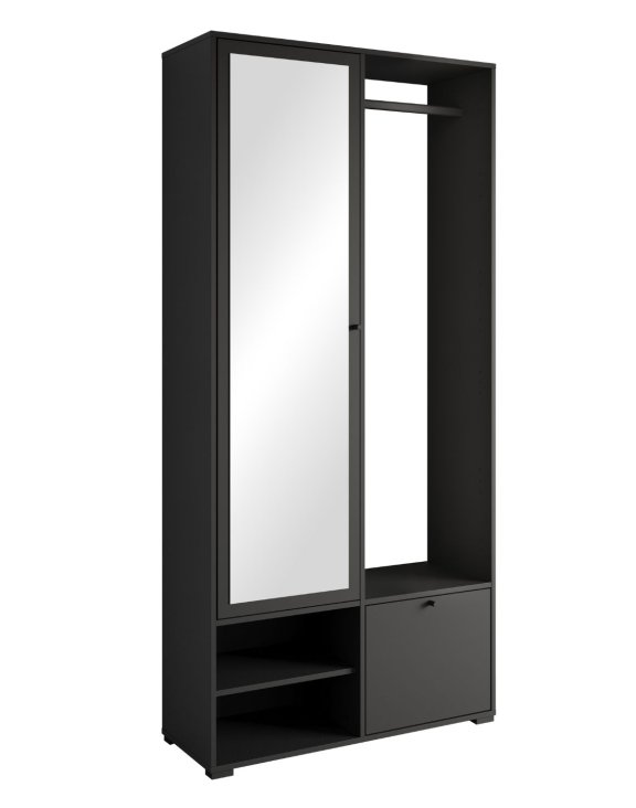 Šatná skriňa Dino vo farbe čierny grafit je elegantný, moderný a mimoriadne funkčný kus nábytku, ktorý sa skvele hodí nielen do predsiene, ale aj do menšej šatne alebo spálne..