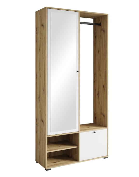 Šatná skriňa Dino v dekore dub artisan v kombinácii s bielymi čelnými plochami je elegantný, moderný a mimoriadne funkčný kus nábytku, ktorý sa skvele hodí nielen do predsiene, ale aj do menšej šatne alebo spálne..