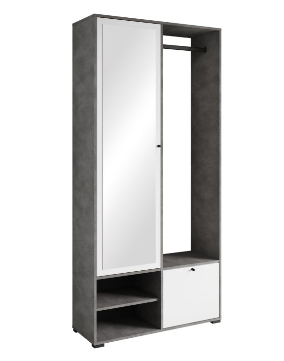 Vnútorné usporiadanie nábytku je navrhnuté s dôrazom na každodenný komfort a pohodlie pri používaní. Na ľavej strane sa nachádza uzatvárateľná časť s praktickými policami, ktoré umožňujú prehľadné uloženie obuvi, kabeliek, čiapok, rukavíc alebo ďalších drobných doplnkov. Police sú usporiadané tak, aby pojali nižšiu aj vyššiu obuv a maximálne využili dostupný priestor.