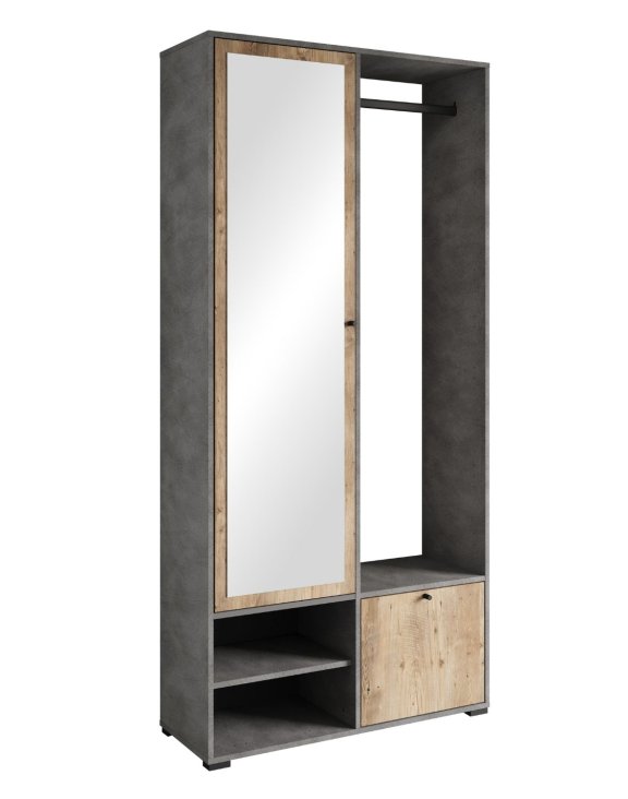 Vnútorné usporiadanie nábytku je navrhnuté s dôrazom na každodenný komfort a pohodlie pri používaní. Na ľavej strane sa nachádza uzatvárateľná časť s praktickými policami, ktoré umožňujú prehľadné uloženie obuvi, kabeliek, čiapok, rukavíc alebo ďalších drobných doplnkov. Police sú usporiadané tak, aby pojali nižšiu aj vyššiu obuv a maximálne využili dostupný priestor.