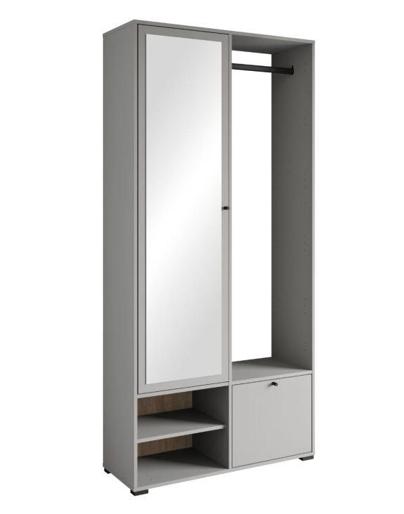 Šatná skriňa Dino v sivej farbe je elegantný, moderný a mimoriadne funkčný kus nábytku, ktorý sa skvele hodí nielen do predsiene, ale aj do menšej šatne alebo spálne.