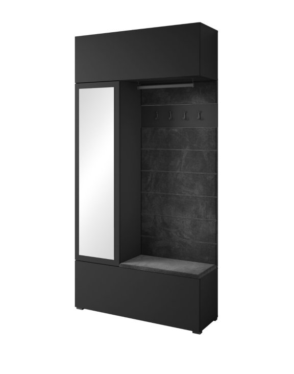Stredná otvorená časť zostavy slúži na každodenné používanie. Nachádzajú sa tu štyri pevné háčiky na oblečenie a šatní tyč na pohodlné zavesenie kabátov či búnd. Celok dopĺňa mäkký sedák a operadlo čalúnené látkou (Mono 248) v grafitovo čiernom odtieni.