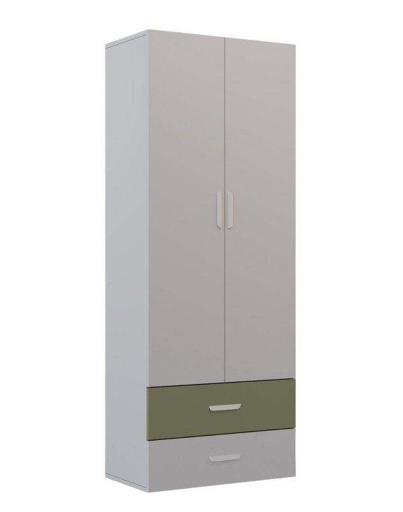 Šatníková skriňa Lumi v jedinečnej farebnej kombinácii kašmíru a olivovo zelenej je kompaktné, ale priestranné riešenie do detskej alebo študentskej izby.
