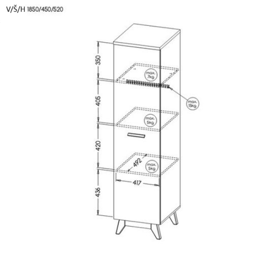 Vysoká konštrukcia umožňuje maximálne využitie priestoru a pevné nožičky spolu s drevenými úchytkami v prírodnom odtieni podčiarkujú odolnosť a estetiku nábytku.