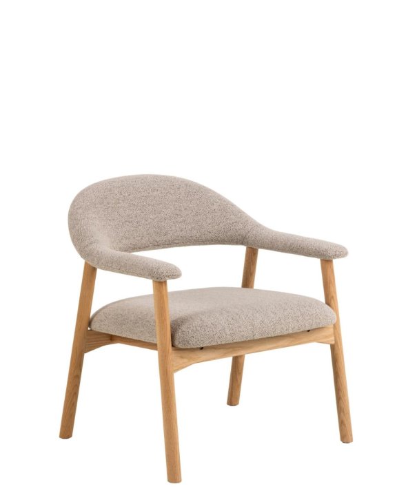 Sedák a operadlo sú potiahnuté béžovou tkaninou s bouclé štruktúrou, ktorá je príjemná na dotyk a dodáva kreslu útulný vzhľad.