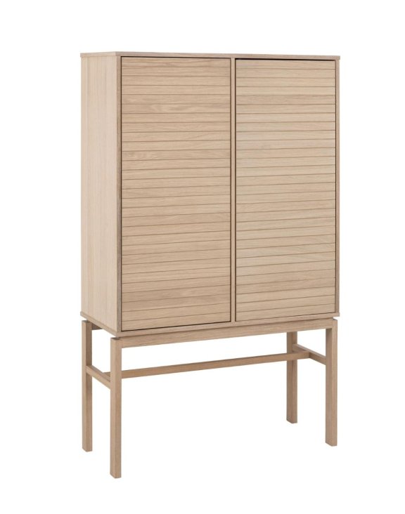 Skrinka má 4 police a dvierka s lamelovým čelom a funkciou otvárania zatlačením.
