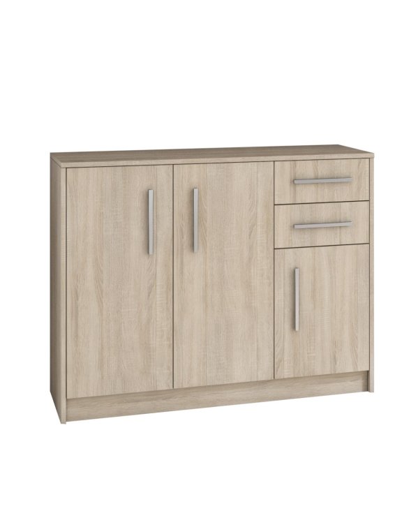 Skrinka na topánky je vybavená trojicou klasicky otvárateľných úložných priestorov a dvomi praktickými zásuvkami, čo umožňuje prehľadné uloženie obuvi aj doplnkov.