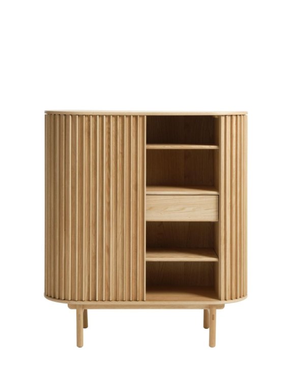 Matný povrch v odtieni prírodného duba spolu s zaoblenými tvarmi a čelnými lamelami s integrovanými úchytmi podčiarkujú remeselný charakter nábytku a škandinávsku eleganciu.
