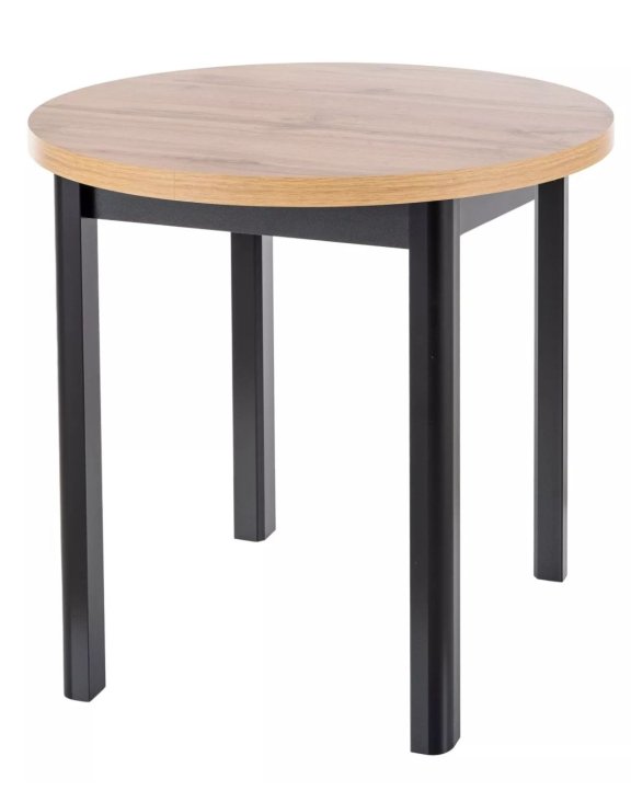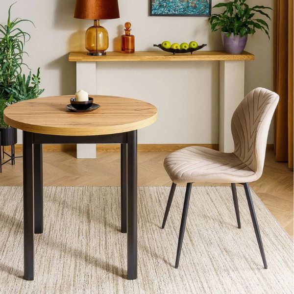 Okrúhla doska v dekore dub artisan a pevná podnož z MDF v odtieni čierny mat vnesú do vašej jedálne útulný a harmonický nádych.