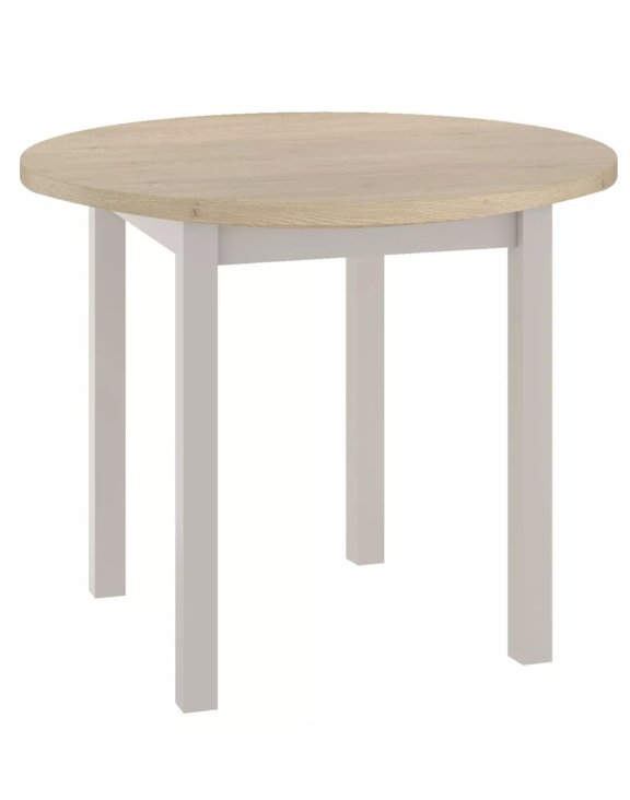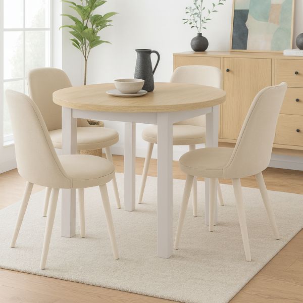 Okrúhla doska v dekore dub cremona a pevná podnož z MDF v odtieni Kašmír vnesú do vašej jedálne útulnú a harmonickú atmosféru.