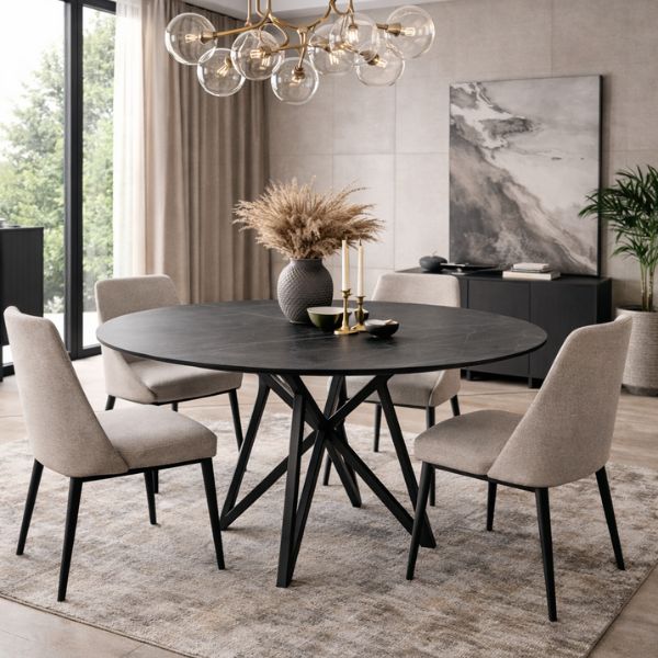 - Vyniká okrúhlou keramickou doskou s mramorovým dekorom, ktorá dodáva interiéru luxusný vzhľad a vytvára príjemné prostredie na spoločné stolovanie.