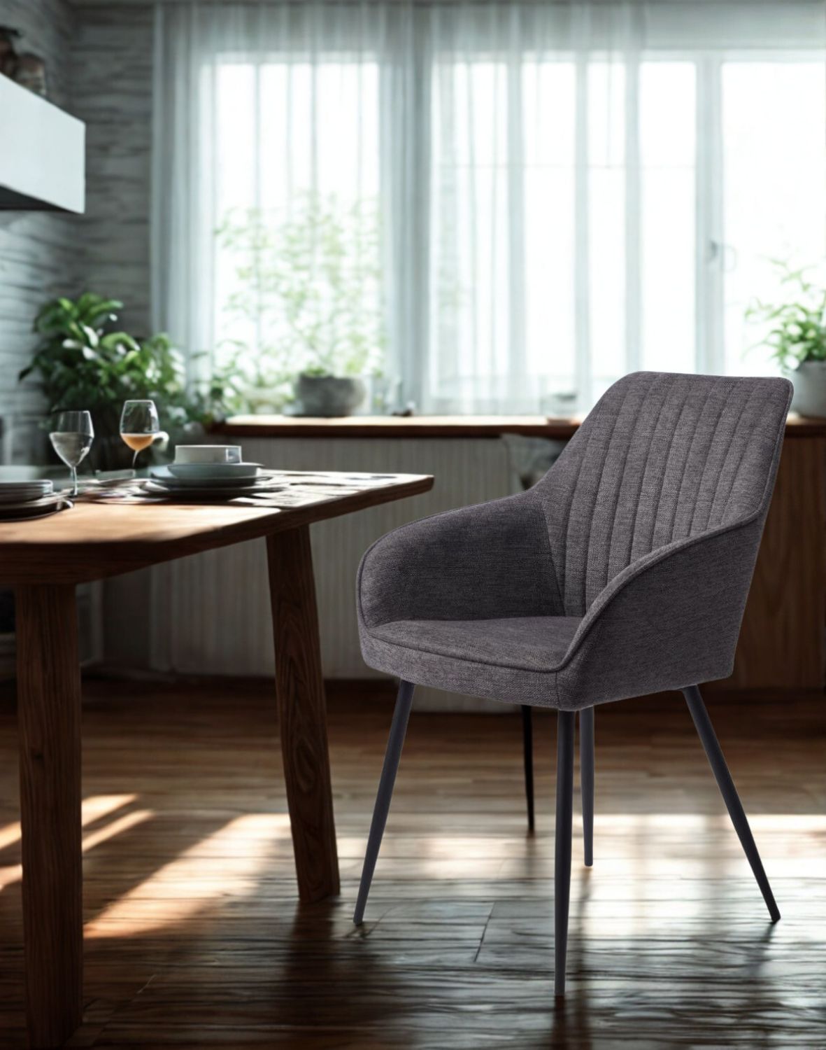 Kombinácia štruktúrovanej látky a štíhlej kovovej podnože robí z tejto stoličky ideálnu voľbu do obývačky, jedálne, kancelárie aj komerčných priestorov.
