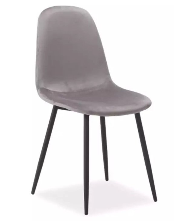 Moderná stolička Fox Velvet je elegantný nábytok v škandinávskom štýle — čalúnená zamatovou látkou Velvet (sivá tap. 93), usadená na štíhlej čiernej kovovej konštrukcii.