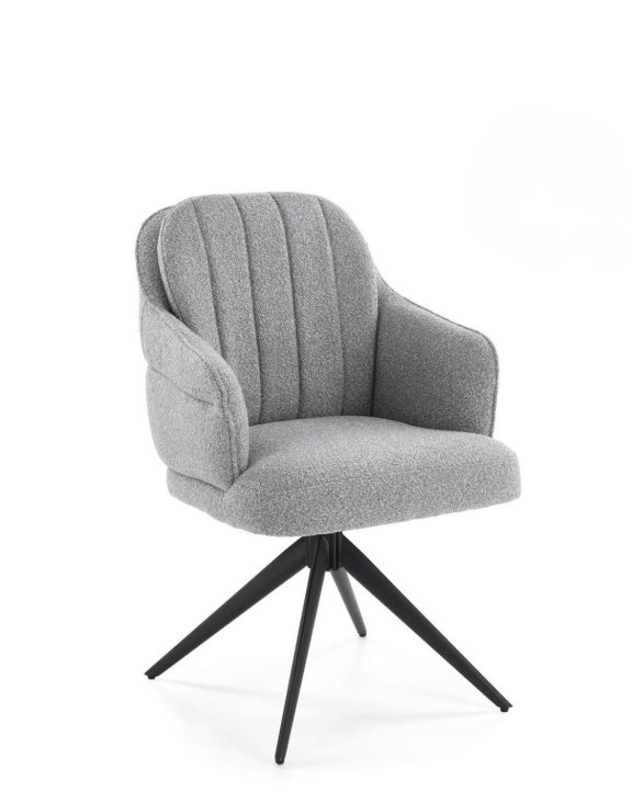 Čalúnenie z mäkkej, príjemnej látky typu boucle v módnom sivom odtieni dodáva stoličke elegantný a štýlový vzhľad a zároveň vnáša do interiéru útulnú atmosféru.